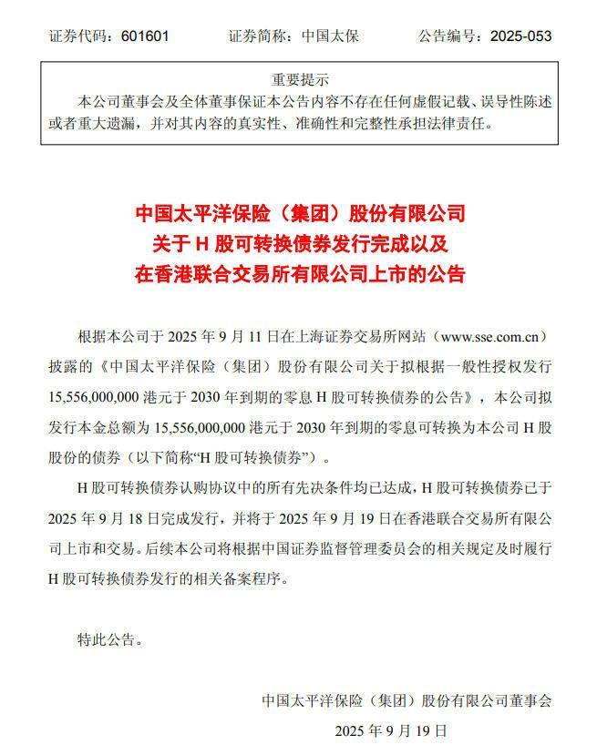 9月18日,中国太平洋保险股份有限公司(601601.SH/02601.HK,下称“中国太保”)发布公告称,已完成发行总额为155.56亿港元的零息可转换债券免息炒股配资,该债券将于2030年到期。